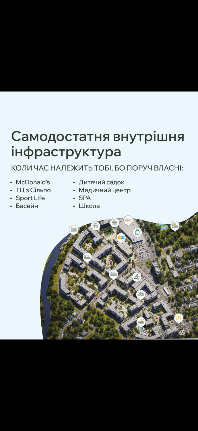Тут все поруч: McDonald’s, SportLife, школа та садок, приватна клініка, басейн, Central Mall & Silpo, кафе, фудкорти, прогулянкові променади.