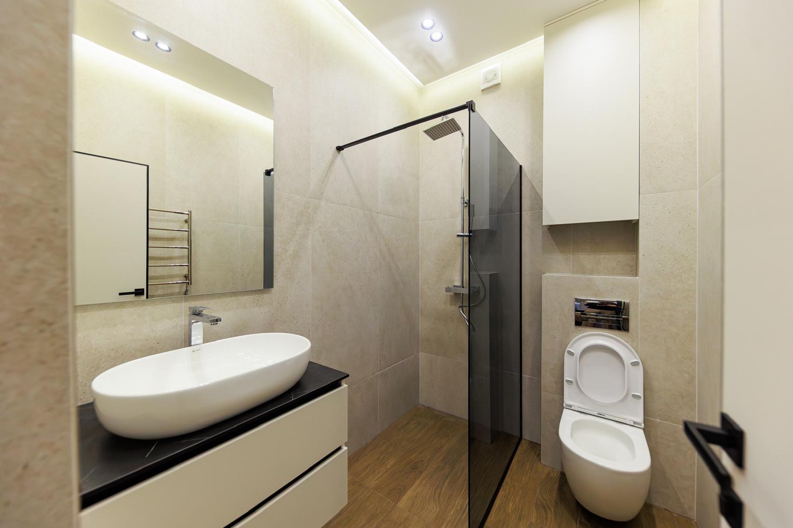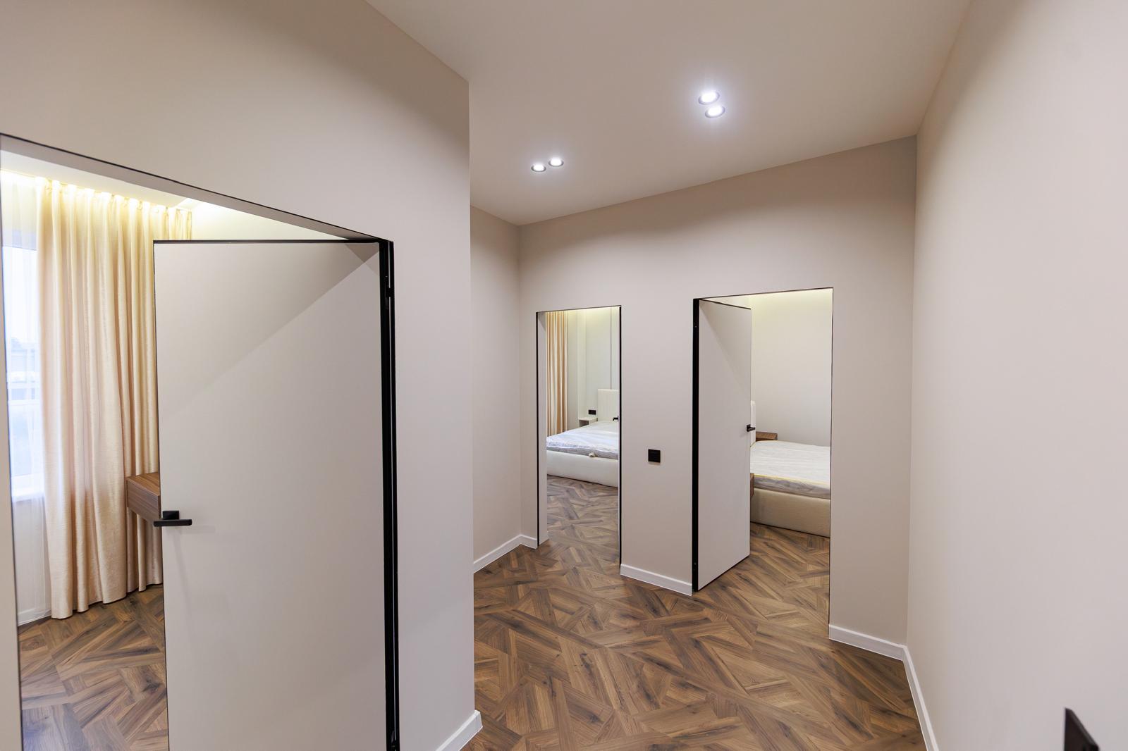 Підлога: ламінат, плитка на кухні, плитка у ванній;