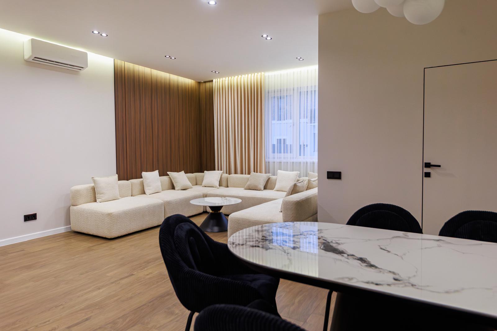 На 1 поверсі розміщена простора кухня-вітальня повністю обладнана всією сучасною вмонтованою побутовою технікою, великою відпочинковою зоною, санвузол. Також на 1 поверсі знаходиться вихід на простору терасу площею біля 50 м.кв.